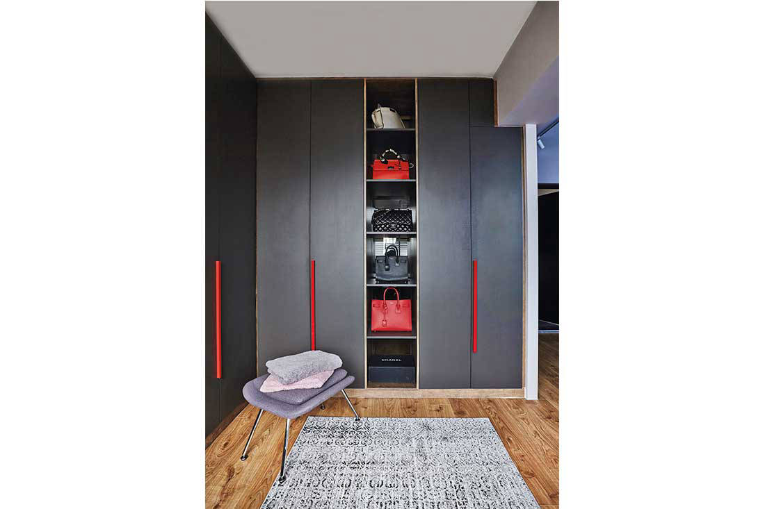 Two rooms have been combined to form a master suite. One serves as a wardrobe and vanity area. Unlike the subdued tone in the sleeping quarters, this dressing zone features punches of chilli red in the form of metal wardrobe handles, which look particularly striking against the wardrobe’s matt black laminated doors. Along with the natural oak-look flooring (which is also used in the living and dining area), a modern-luxe look is achieved.