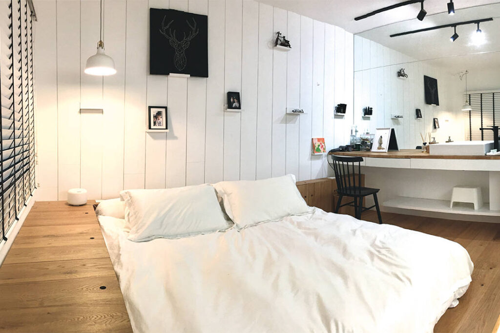 Knowing how fond the owners were of the times they spent in Australia, Cheah Sheh decided to capture the mood and feeling of the place by designing the flat to look like a modernised barn house. This was achieved through the incorporation of elements such as white painted wooden panel strips that run across the entire wall separating the public and private zones. The sliding door to the family room can also be closed for privacy, or opened to create a more open and fluid space.
