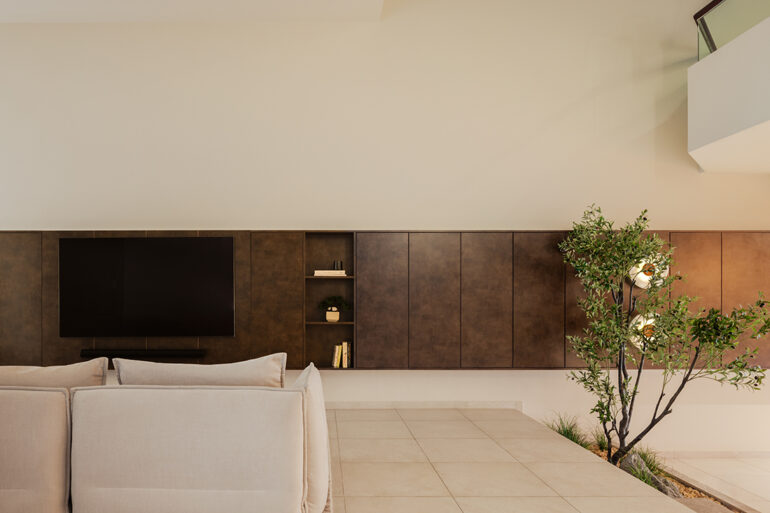 On the ground floor, the living and dining areas unfold as a continuous space, defined subtly through furniture placement and changes in level rather than walls. Integrated cabinetry keep the living room visually light, while indoor greenery adds texture and a sense of pause. The dining area, positioned beside the kitchen, is pared back and functional — warm timber furniture, discreet storage and soft pendant lighting allow daily life to flow without visual clutter.