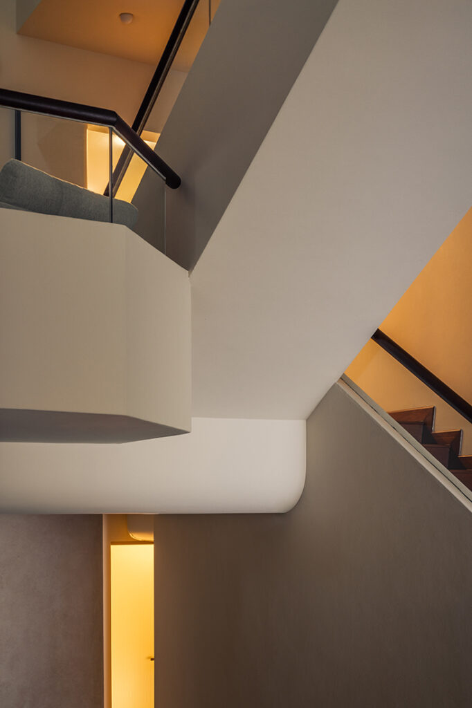 Lighting plays a key role in shaping the home’s atmosphere. “Layered artificial lighting and reflective surfaces were introduced to brighten the home,” Tee Ping says, addressing the realities of limited daylight typical of inter-terrace houses. Warm wall sconces and concealed lighting wash across surfaces, enhancing depth while keeping the mood calm and understated.