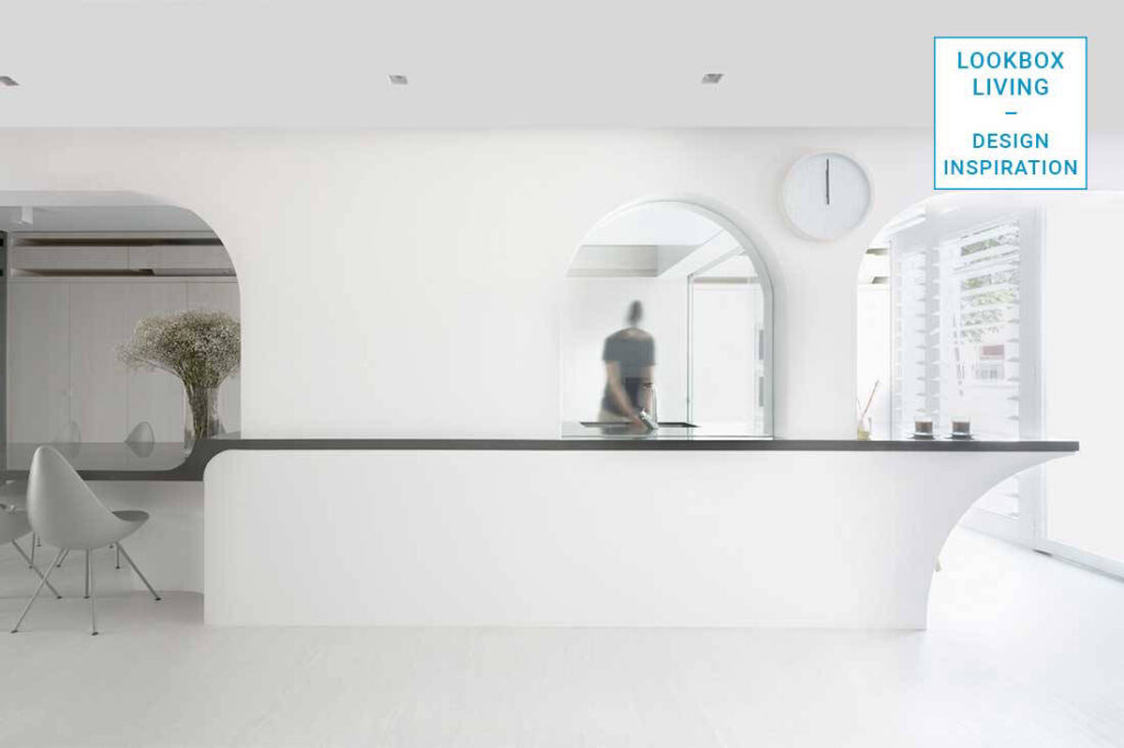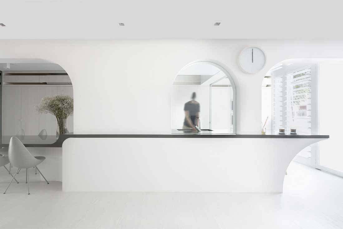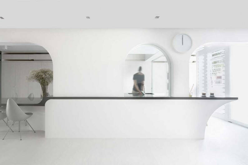 The designers also took care in integrating details that help to enhance the family’s daily life. These include hiding storage, plumbing and electrical services. They share: “To conceal these services, the carpentry had to be carefully detailed – even how the airflow vents of the air-con are designed plays an important part in the aesthetic detailing of the built-in carpentry.” Another interesting detail is the introduction of arches and curvatures in the table structure that soften and nicely round off the minimalist edge of the overall design.