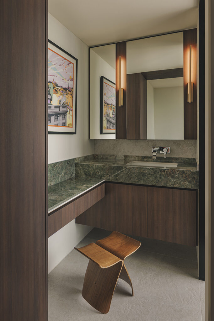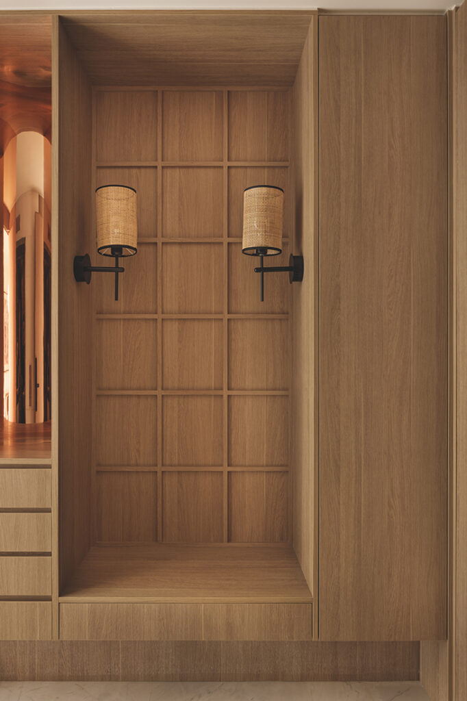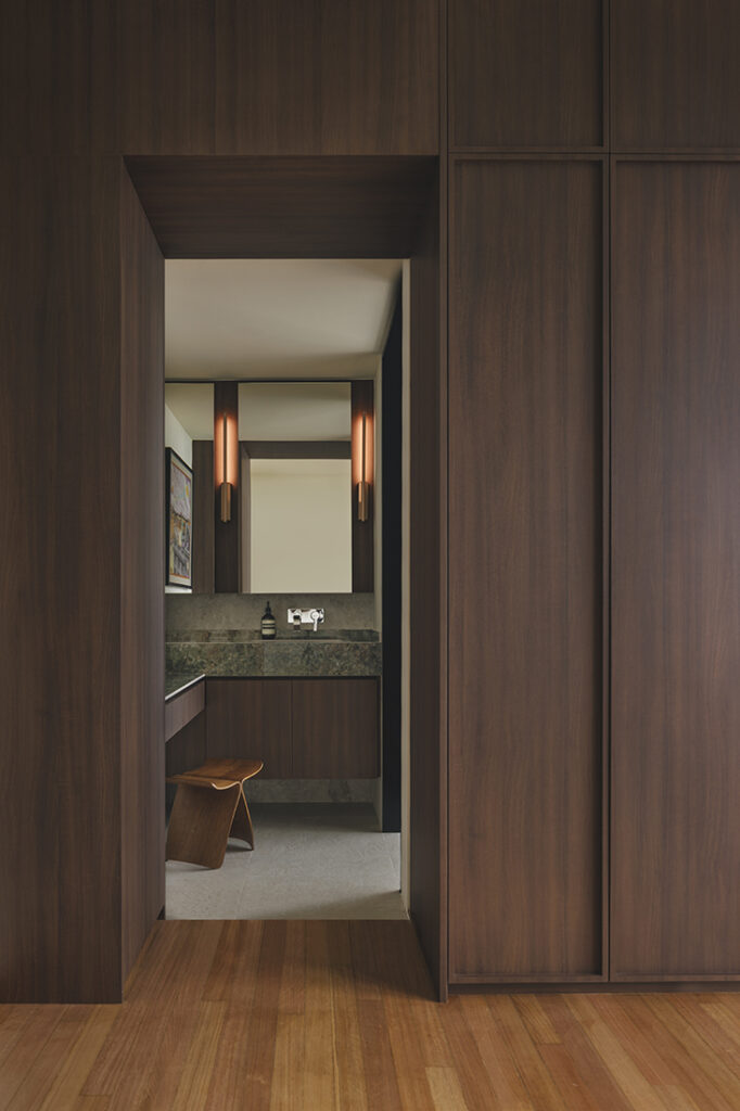 A consistent palette of mid-tone wood laminates establishes the home’s muted mid-century modern direction. Carpentry panelling, stone surfaces and carefully selected furniture pieces add depth while keeping the interior visually calm.