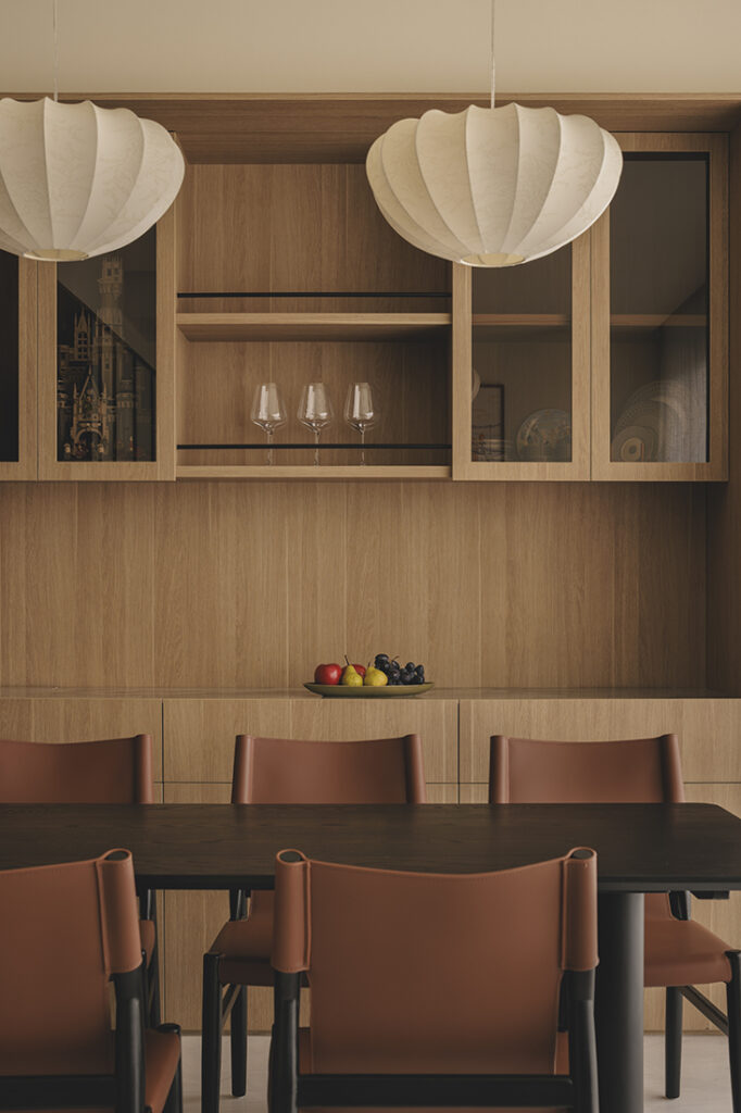 Entertaining was a key part of the homeowners’ brief. In the dining area, a full-height carpentry wall incorporates storage, display shelving and a bar with a wine fridge — a fitting backdrop for evenings spent hosting friends.