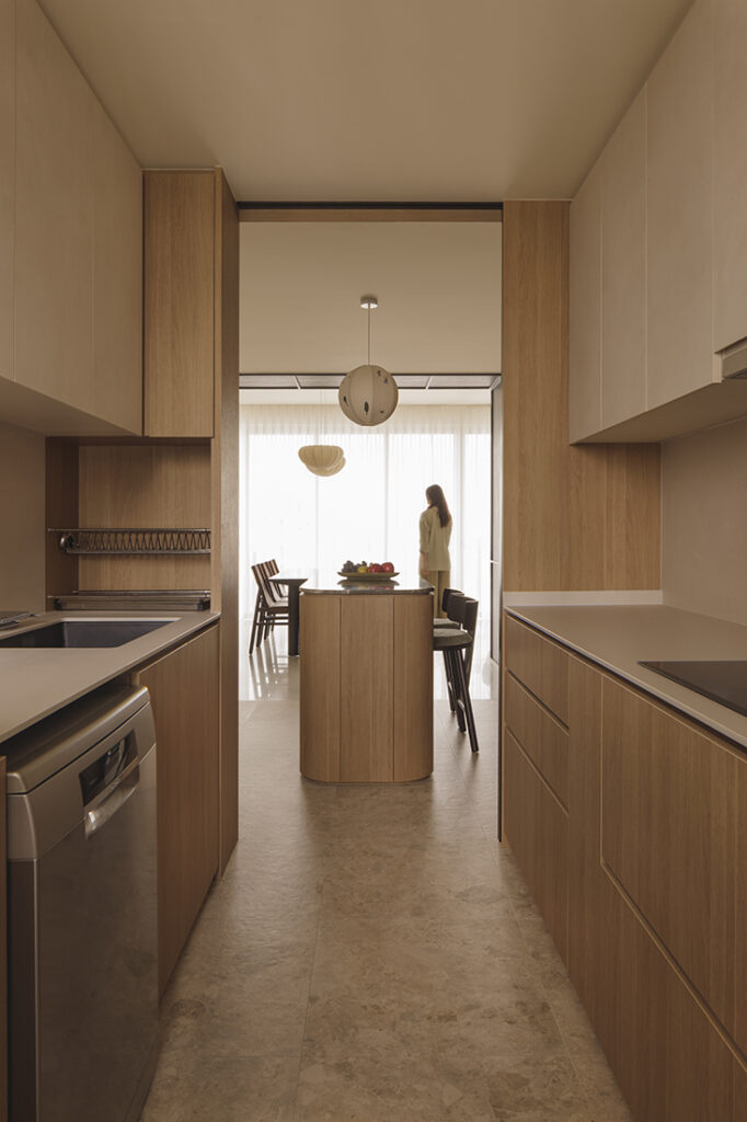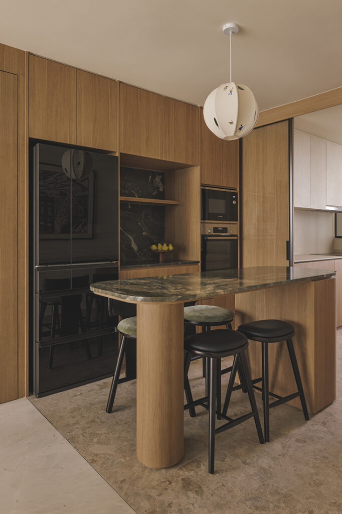 The adjacent dry kitchen was also reworked. The previous peninsula counter was replaced with a rounded island that doubles as a breakfast spot and coffee station, while a pantry niche keeps everyday items organised. Behind it, the wet kitchen was fully refreshed with new cabinetry, countertops and tiles.
