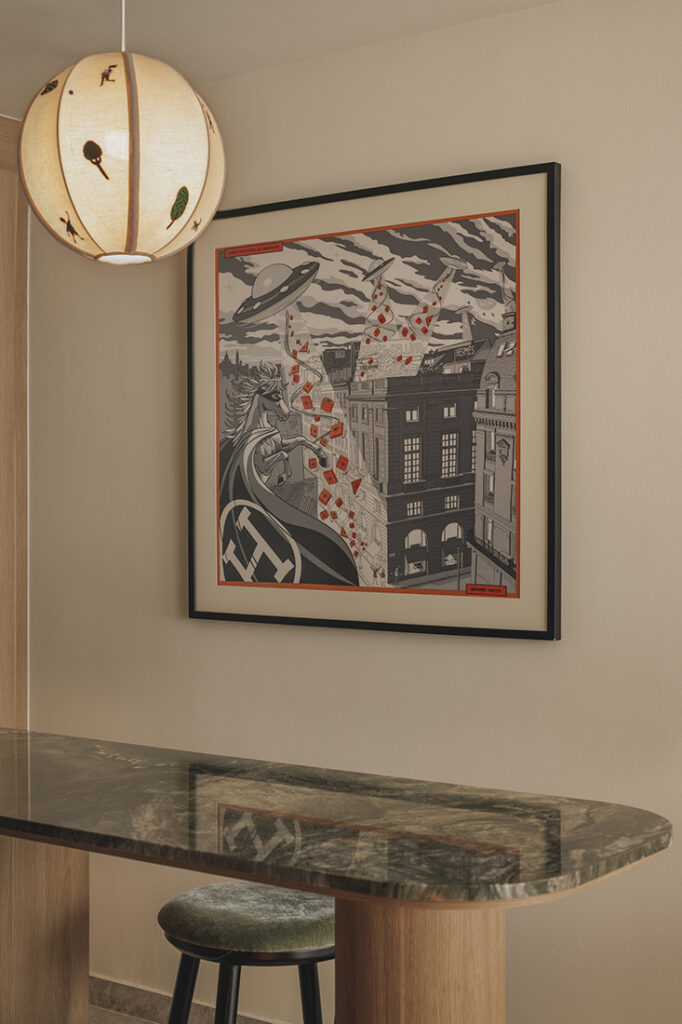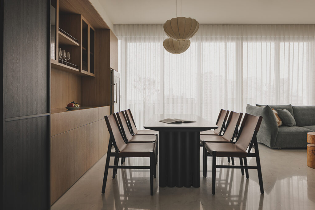 Beyond it, the living and dining areas open into a calm composition of timber, soft neutrals and warm leather tones. Sheer curtains diffuse daylight across the marble flooring, while graphic artworks introduce moments of colour that bring personality to the otherwise restrained palette.