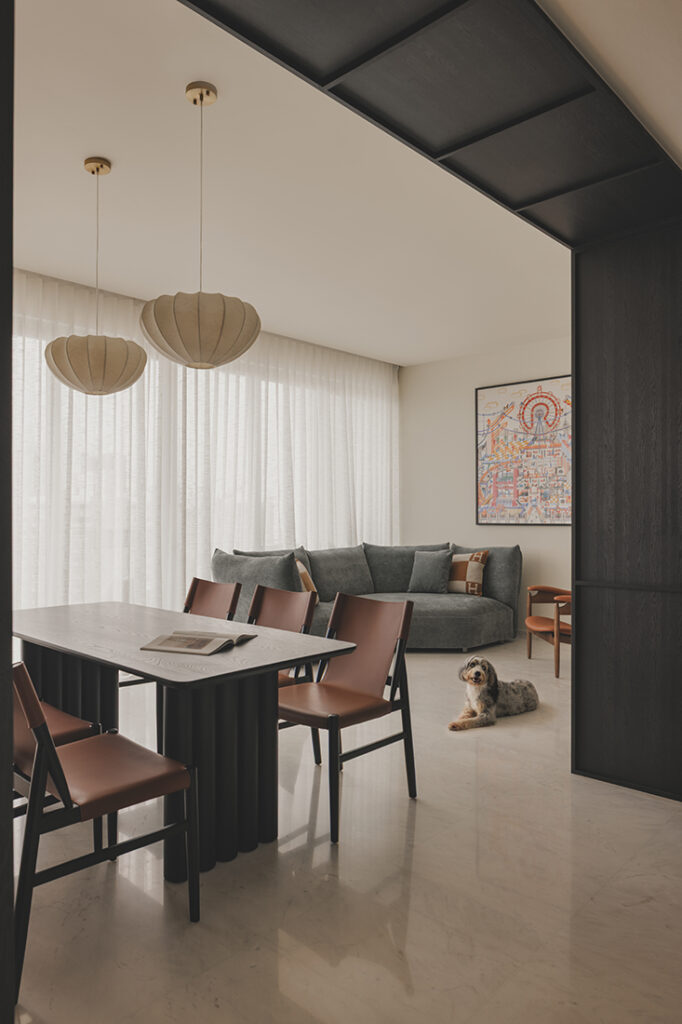 When the couple engaged Eunyce Chu of Home Guide Interior Design to renovate their three-bedroom resale apartment, they asked for a similar atmosphere: calm, tactile and comfortable enough for everyday living. The home also needed to accommodate their mid-sized dog, support flexible work-from-home arrangements, and host frequent gatherings with friends. Completed in three months at a renovation cost of around $130,000, the project focuses as much on spatial clarity as on material expression.