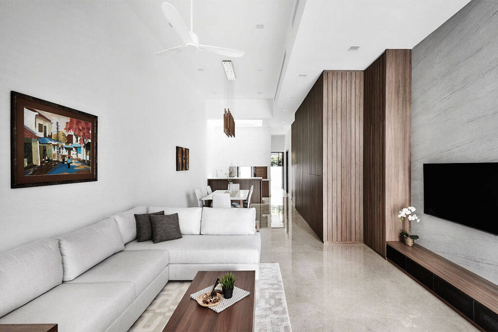 The designers at Couple Abode respected the family’s love for dark wood and wanted to integrate it into the interior design in practical ways. They achieved this by incorporating dark balau wood-look laminates in the living area. The strips of wood add warmth and depth to the home, and stand out especially well against the large expanses of white walls. The result is a feature that dramatises the verticality of the home.