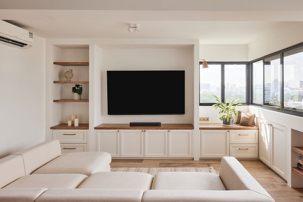 Given the homeowners’ love for hosting, the dining space needed to be both functional and stylish. Ethereall designed a seamless island-dining combination, a space-saving solution that maximises openness while allowing room for the homeowners’ dream oversized couch.