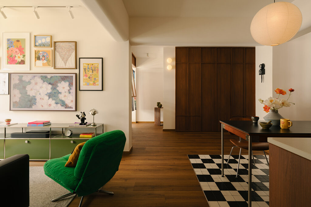 Throughout the flat, materiality plays a diplomatic role – walnut wood tones serve as a warm bridge between styles, paired with cabinetry details and clean lines that nod to Scandinavian simplicity. In the kitchen, the black-and-white checkerboard floor tile feature is a retro throwback, anchoring the dining and pantry zone without adding weight. “We went with a custom black-and-white mix that almost reads like a graphic rug – it helps break up the open-plan layout and defines the kitchen and dining zones without adding bulk,” Debbie explains.