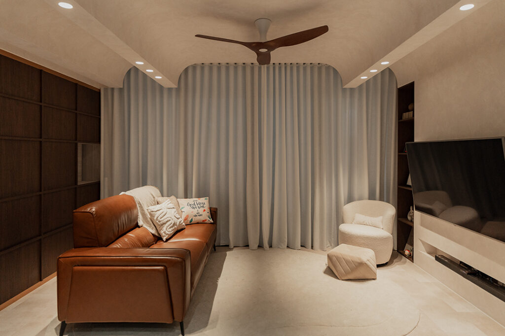 Greeting guests at the calming foyer is an integrated planter with an evergreen plant – a symbol of life and family growth. Travertine-veined walls and stone-inspired vinyl flooring lead into the main living area, where the curved ceiling appears to drip with morning light, a poetic nod to the inspiration behind the design: “The morning dew that drips to the tip of leaves.”