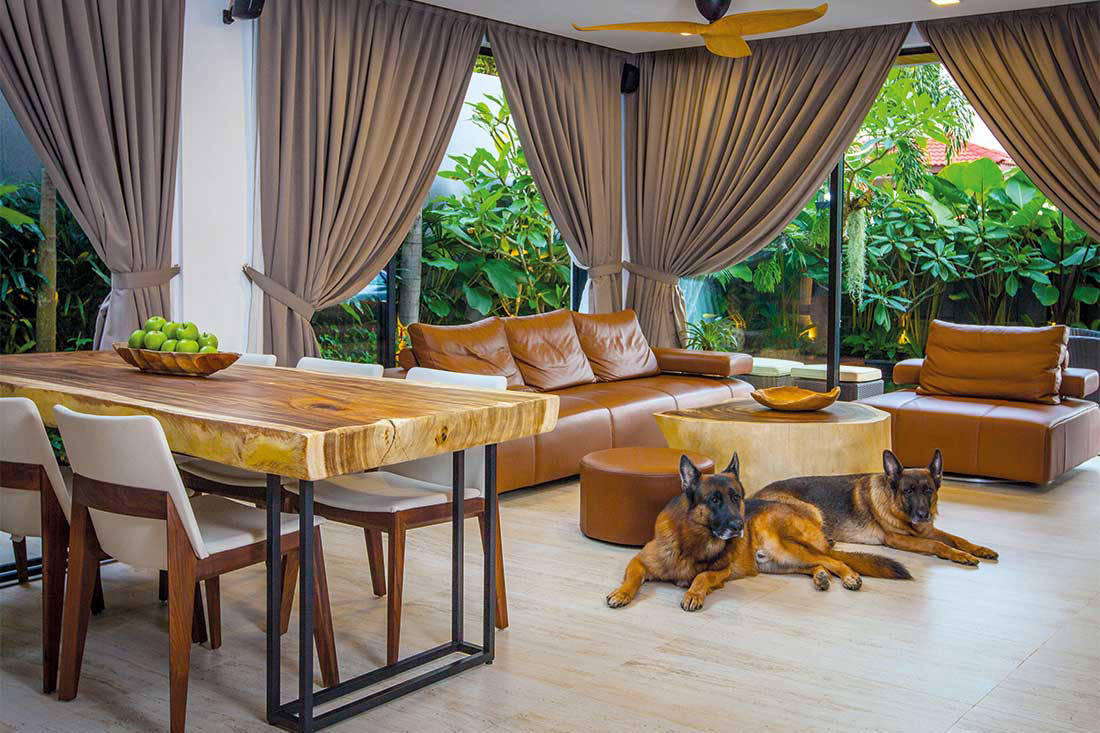 Those who first step into this house will be greeted by a koi pond and lush greenery, while wood decking adds to the tropical atmosphere.