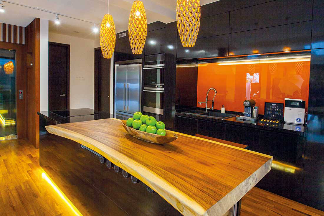 Influences of nature continue in the kitchen. Dark woody tones are employed in the open-concept kitchen. To make the space conducive for entertaining, the island counter is equipped with a cooktop and a wine chiller. The counter’s suar wood top also makes a striking focal point, while glossy black cabinets and black galaxy granite surfaces inject a modern and elegant element into the space.
