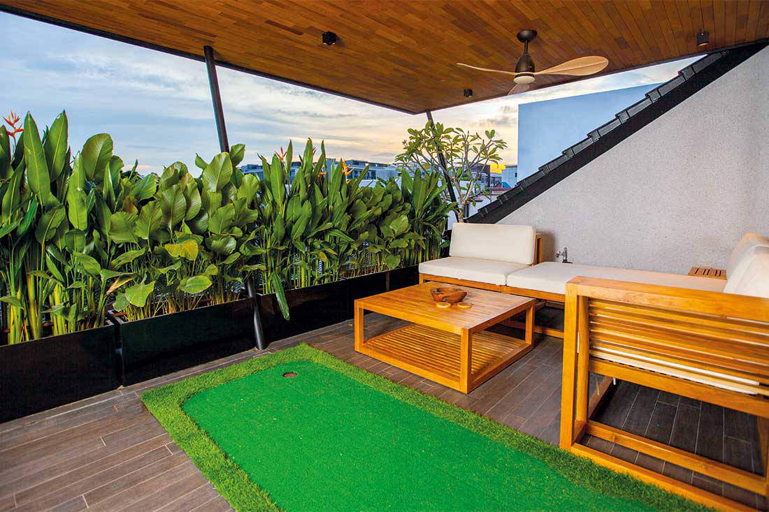 The master bedroom on the attic level opens out to a roof terrace where the homeowners can sit back and enjoy the view. Wood-look homogenous floor tiles maintain the atmosphere of a tropical oasis while keeping the space easy to clean and maintain.