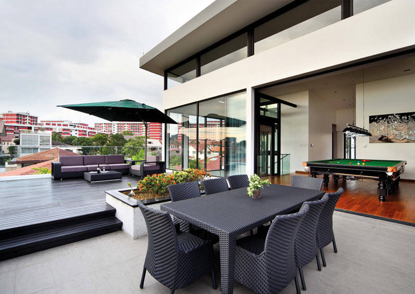 On the roof deck, the designers created an outdoor living area, accompanied by a dining set perfect for meals under the stars. Beside this, a large games room features a full-size billiard table.