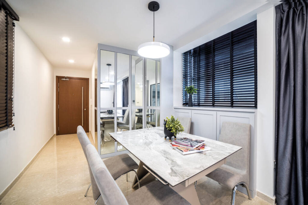 Although the dining area isn’t spacious, Lucas managed to build a tall unit here and storage cabinets by the window to house the meter box, shoes, modem and other household items. The former is clad with mirrors to reflect light and give the illusion of space.