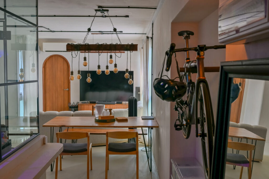Both husband and wife are avid gamers and the husband is also a cycling enthusiast, and so it was important to carve out spaces in this five-room flat for these hobbies.