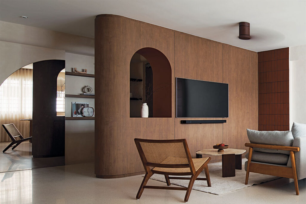 This cosy dwelling is designed for a couple who enjoys spending quiet time together. “The house is supposed to have an earthy, natural feel to it, which is why we used materials like real terrazzo flooring and wood-inspired laminates that look a little raw. Limewash paint is also used to create an interior reminiscent of a cave,” says Jasper Goh, Creative Partner at Ascend Design.