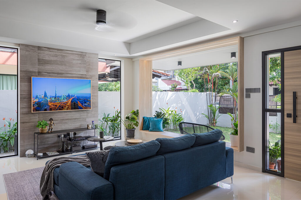 To allow more natural light to penetrate the living area, the large French windows facing the front garden were converted into a massive single 2.7-metre-wide bay window from which the family can lounge on and gaze out from. Narrow full-height windows were created to flank the adjacent television wall, which has been sheathed in matte grey stone-effect large format tiles. A storage unit was built onto the back wall, finished in matte black laminates from Fenix NTM that are also used for the kitchen cabinetry. The fluted panelled compartment of the unit hides a structural column that would otherwise look out of place.