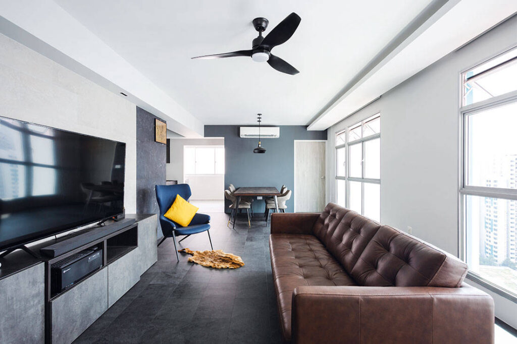 While most homeowners play it safe with the modern contemporary style, this young singleton wanted to up the style game for his four-room flat. Designer Edmund Ong from D’ Initial Concept says: “The homeowner wanted a contemporary look with simple neutral tones, but he also wanted to experiment with materials and textures.” Armed with this design vision, the design team gave the TV feature wall a unique tiled finish, and incorporated vinyl flooring in edgy slate-effect patterns.