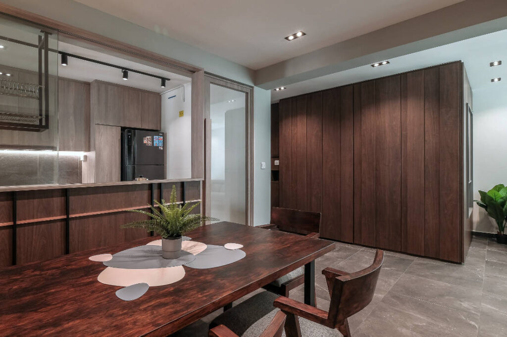 To offset the heavy palette, Gabriel had the dining area wall removed, creating open, interconnected spaces as a result. Even with such a tight footprint, the designer was able to fit a sizable table that can comfortably seat five adults.
