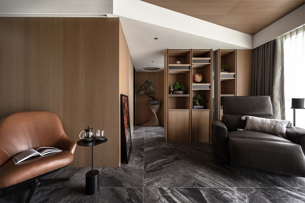 In response to the brief, the designer has completely redesigned the flat’s layout where, in his words “nothing was kept except the windows of the house”. The unit’s two bedrooms have been combined into one, dramatically enlarging the couple’s resting quarters. The demolition of a wall to one of the rooms also allowed the designer to replace it with display shelving for the couple’s bonsai, as an alternative divider between the living area and the enlarged master suite.