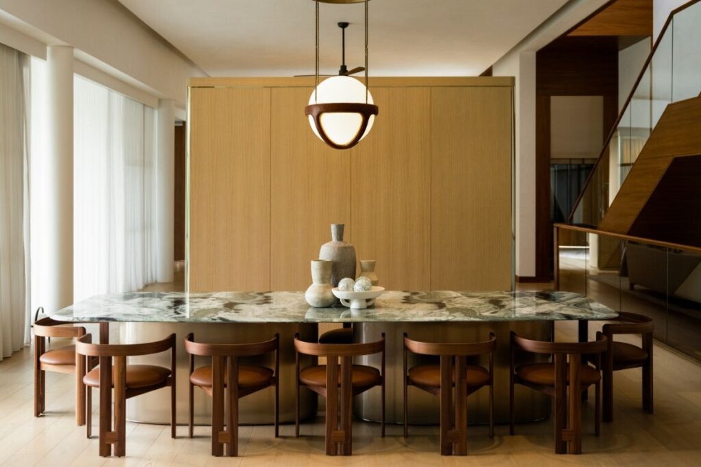 It is palpable that each space was painstakingly thought through, with considerable coordination between proportion, material and detail. For example, the walnut timber and slim proportions of the Tacchini Pigreco dining chairs make them subtle complements to the green Corteccia stone tabletop with flowing veins.