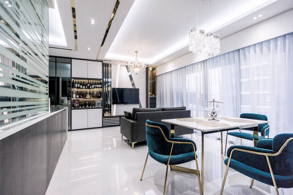 While Swarovski chandeliers and gold mirror strips dial up the glamour, grey tone laminates, and white floors and ceilings make for a timeless base. This results in a space that is luxurious and homely at the same time. So as not to sacrifice comfort, a classic sofa and cushy dining chairs are ideal for long conversations when entertaining guests.