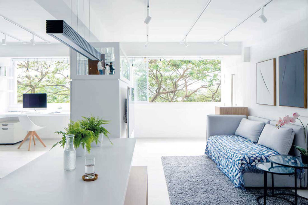Vincent shares: “We wanted as much of the apartment to have views of the rain trees as possible. Even from the kitchen, you can see the trees. A fixed glass panel was inserted in the master room for a direct visual connection to the trees, swaying beyond the lively living space. For privacy, the roller blinds can be lowered.” The impressive design has been successful in ‘borrowing’ outward views from the deeper reaches of the apartment.