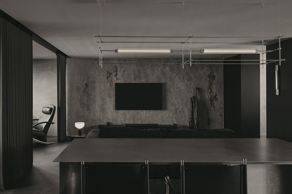 Set within a late-‘90s apartment, the interiors are stripped down to their elemental core. A palette of moody greys and deep blacks creates a quiet, contemplative mood, while the raw beauty of concrete, troweled cement, and steel is allowed to speak for itself. Surfaces aren’t concealed or corrected; instead, their natural imperfections are embraced, turning walls and floors into a living texture.