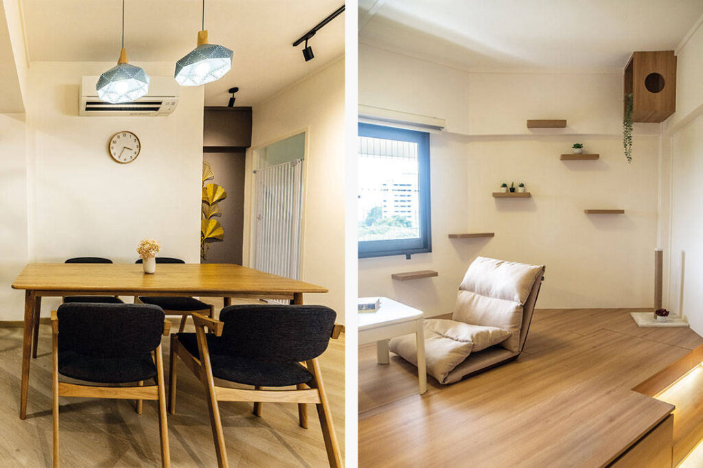 The study room is an open and spacious multipurpose area. Here, the homeowners have the freedom to utilise the room whenever they need additional space. A built-in, wall-to-wall desk provides ample space for both homeowners to work simultaneously, with matching top cabinets that provide more than enough storage for the couple. A ‘cat tree’ allows the homeowners’ beloved pet to spend time with them even when they are busy working from home.