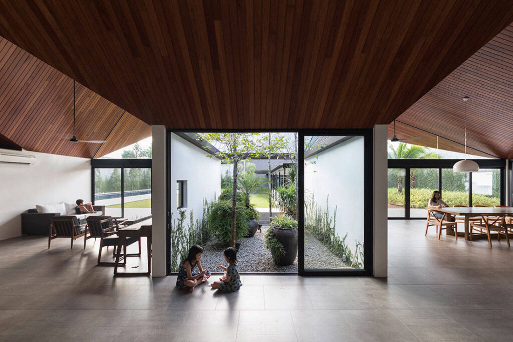 Explains Alan Tay, a Partner at Formwerkz Architects, “The pitched roof, a cornerstone element of tropical architecture, is inverted and expressed as a key architectural ceiling feature in the house. The roof slopes toward the courtyards in a reverse pitch fashion, giving rise to a series of undulating timber ceiling ridges.”