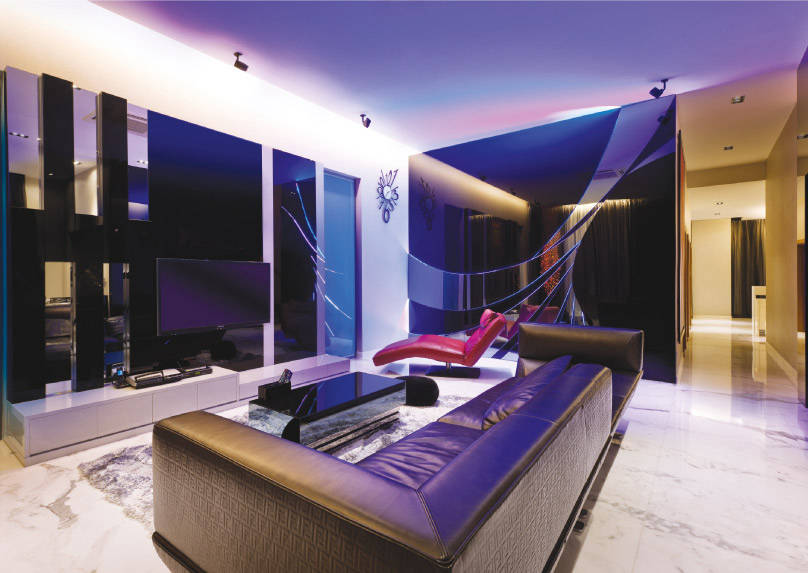 Like a scene straight out of a club, the living area has a club-like vibe, thanks to the use of LED lighting that casts the room in a sensual purple glow. Alternating bands of mirror panels form a central feature wall and on an adjacent wall, swoops and curved lines are articulated on the mirror, adding a sense of dynamism to the space.