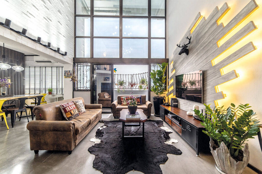 With two storeys to play with, this maisonette boasts a 4.5-metre high ceiling over the living room. Wynn decided to play up this unique feature by giving the ceiling a special design treatment. Chengal wood strips are now suspended from the ceiling, bringing visual interest while drawing the eye up. The design of this ceiling feature also complements the overall industrial look.