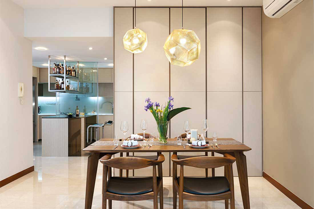 What was previously an enclosed kitchen with a poor flow of natural ventilation and light is now a picture of airy openness. The designers have removed the boundary wall that separates the kitchen from the rest of the home. And in the middle of this revamped kitchen sits a kitchen island with an overhead cabinet above for the display of the owners’ liquor.