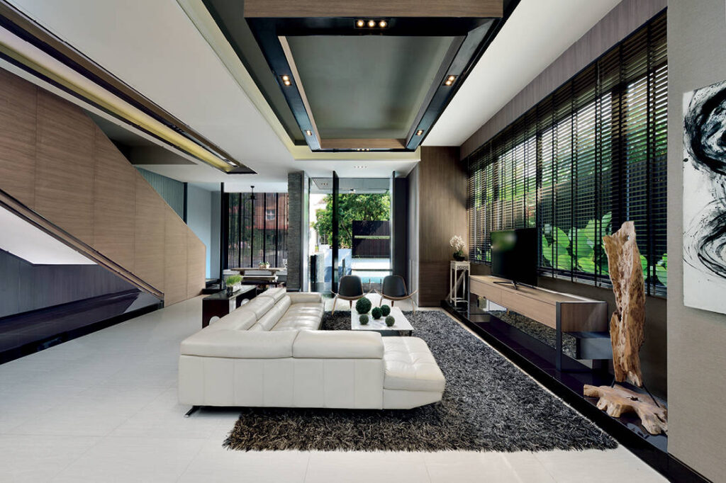The homeowners who lived on the site since 2002 wanted their home to have links to the surrounding greenery. To encourage such connections with nature, numerous windows were added to capitalise on the views of the nearby Bukit Timah Hill. Provision has also been made for a spacious outdoor entertaining space replete with a lap pool at the front of the house. Quartz stone clad the facade from the ground to the roof.