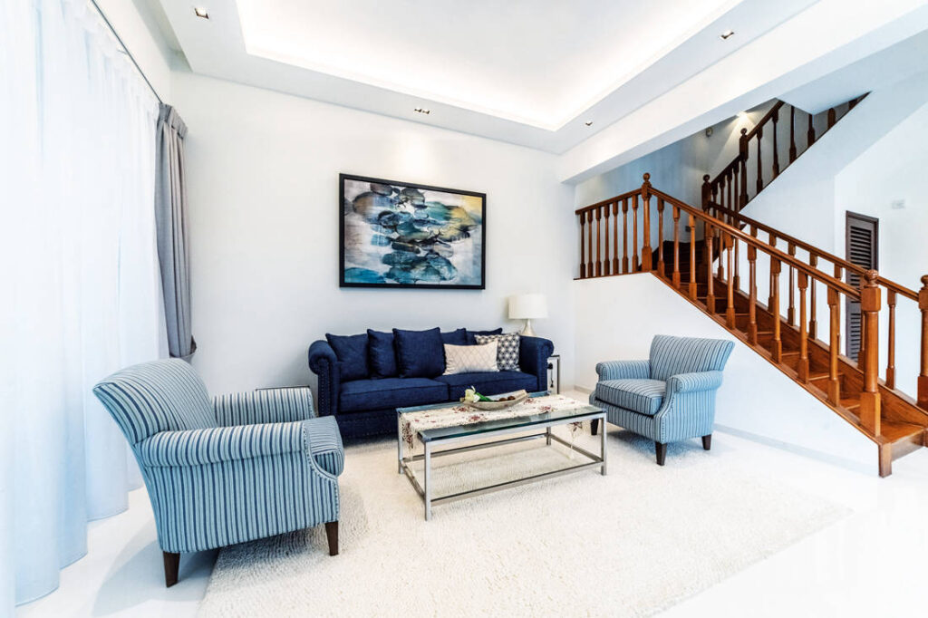 To perk up the living area, the walls are given a lick of white paint, which lend a fresh and airy look. They also present blank canvases for Wynn Neo of I.D.I.D to work in a nautical-themed living room set. With cove lighting and a large area rug anchoring the space, the modern nautical style of this living room is conducive for familial bonding and formal occasions alike.