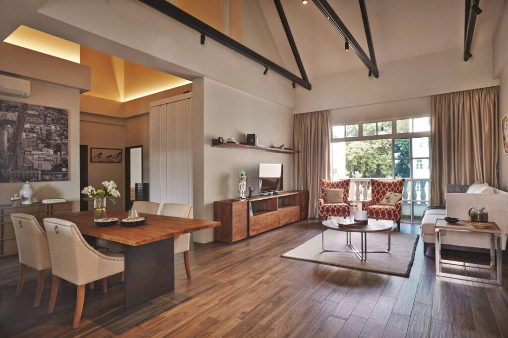 Inspiration struck the team from Joey Khu ID when they noted the homeowners’ love for the cosy and rustic home style. In fact, one of the reasons why the owners bought this apartment is the pitched roof that reminds them of traditional cottage homes from the West. “We were awed by the 6.5-metre ceiling and that pretty much sealed the deal for us to play up the interior design.”
