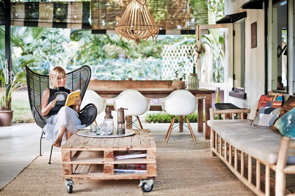 With a one-year lease, you would expect any family with young kids to move in and simply make do with the existing space. Instead, interior designer Barbara Fritschy and her husband, Joost, did just the opposite. They put in an elevated swimming pool with wood decking and an outdoor shower. Barbara also designed and constructed a sheltered terrace with concrete flooring that extends outwards from the main quarters.