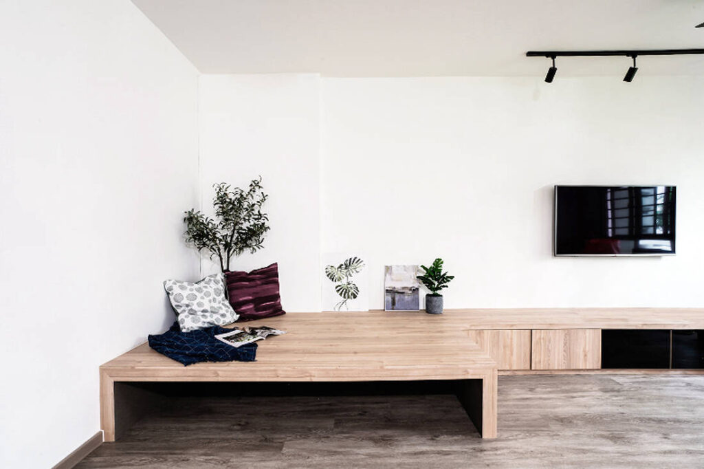 The homeowners preferred a bright interior for their four-room flat, hence Alson Tan of Couple Abode used a light palette of white and pastels. He and his design team also imbued wood patterns into the flat by way of the flooring and custom furnishings.