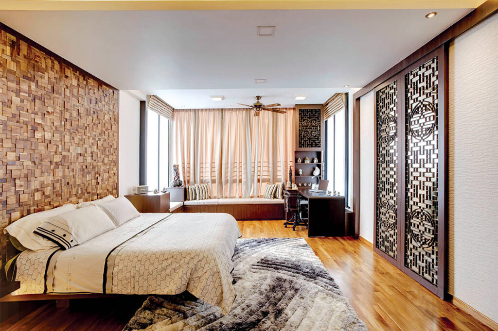 The junior master bedroom resembles a hotel suite, thanks to the intricately designed surfaces. “This room used to have a balcony,” says Json, “but we integrated it into the bedroom.” The bedroom now boasts a bay window and a study, which accentuates its hotel-like style. Another design highlight is the headboard, which sports an interlacing design of reclaimed wood.