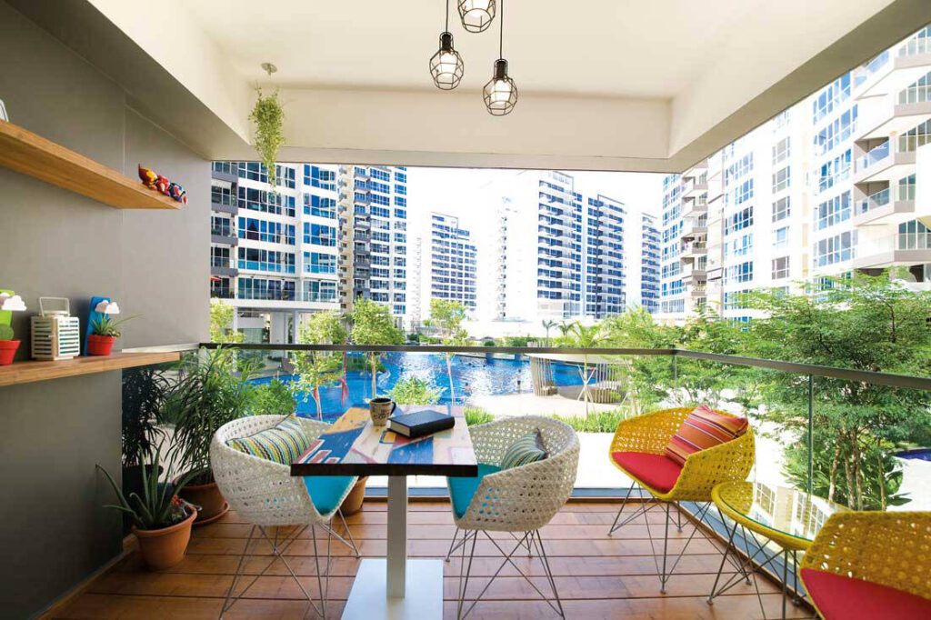 Monti maximised the balcony views of the swimming pool and accompanying greenery by turning this area into a peaceful spot for the family to retreat to. Floor decking and planter shelves were incorporated which, when combined with the owners’ outdoor furniture, enforces a rustic, back-to-nature vibe.