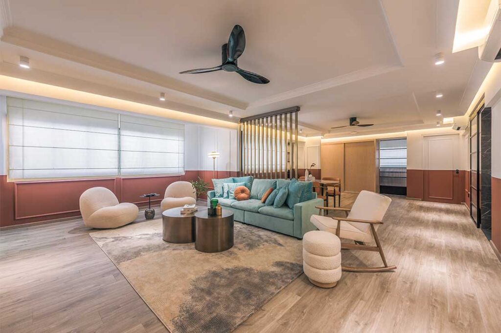 The new owners of this massive executive flat in Bukit Panjang had grand plans for its redesign. After all, it was going to be their much-anticipated first home for their young family of four. While most people are usually taken by a singular aesthetic that they wish to imitate, this couple wanted a unique collage of their favourite interior features, such as cafe-style seating, wainscoting, and luxe hotel vibes for their master bedroom. They engaged the expertise of designers Nigel Ng, of Swift Interior, and Ayu Seng to helm the ideation of the interior concept and to oversee the renovation.