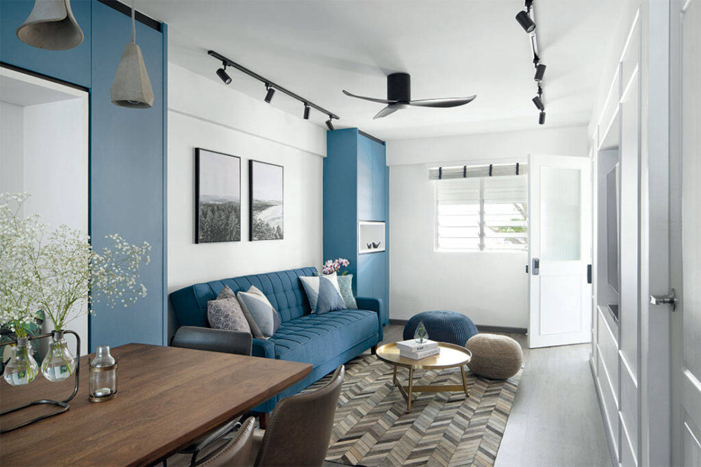 Although a full-height cabinet is the first thing one sees upon approaching the flat, the main entrance opens directly into the living area where a comfy blue sofa takes centre stage. It faces the television area – jazzed up with subtle wood trims – where the white surface matches the bedroom doors. Keeping this entire side of the living area white lengthens the space visually.