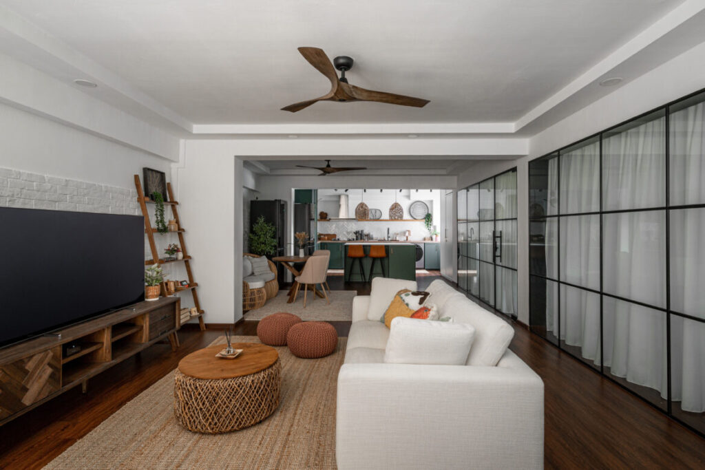 As people who love the outdoors, it was only natural that the owners of this flat yearned for a serene home with an open and airy atmosphere. That resulted in their interior designer, Emma Jin from The Interior Lab, gutting all three bedrooms in this five-room resale flat. In place of the dividing walls are now lattice glass panels to demarcate the private zones from the communal areas.