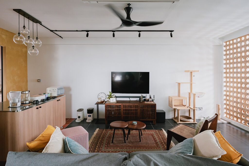 Located in a quiet corner of the Jalan Tenaga neighbourhood, this 1,250-square-foot resale HDB flat is more than a home – it is a carefully crafted retreat, designed around the rhythm of its owners’ lives. Surrounded by peaceful streets, industrial estates with hidden culinary gems, and close to Bedok Reservoir, it offers the perfect setting for a couple with shared interests but distinct personalities.