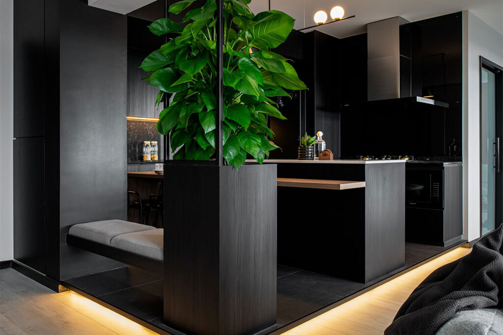 The kitchen sits on a ‘floating’ platform, along with a long island/dining table. There’s even a planter for a touch of greenery, and bench seating, with its position near the foyer making it a convenient spot to put on and remove one’s shoes.