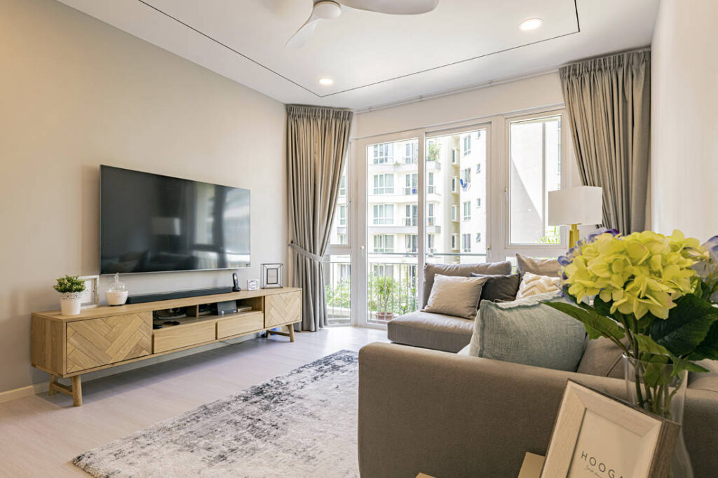 The unit’s advantageous corner location in Edelweiss Park condominium offered a prospect of maximising the views out of the three bedrooms. Hence, it was an opportunity that did not escape the owners, as they wanted the layout to remain unchanged. This is so that all three bedrooms could continue to enjoy the abundance of natural light. The condo’s location amidst lush greenery also drove the designers’ approach to maintain the interiors as simple and pared down, to shift the focus to the landscape and garden outside.