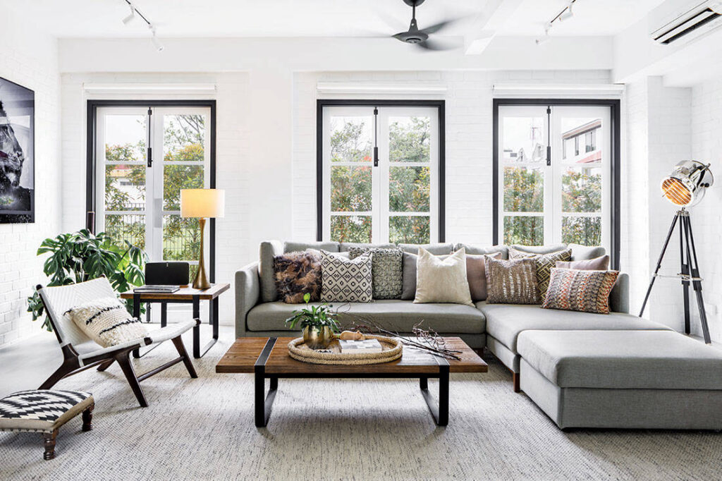 When it came to the interior design, Haüs Atelier played with visual and tactile textures to emphasise the contemporary colonial narrative. This includes the patterned floor tiles that demarcate each room and the linear design of the doors and windows. Especially of note are the soft furnishings like the rugs and throw pillows; the designers specifically chose gentle patterns that were reminiscent of tribal prints./>