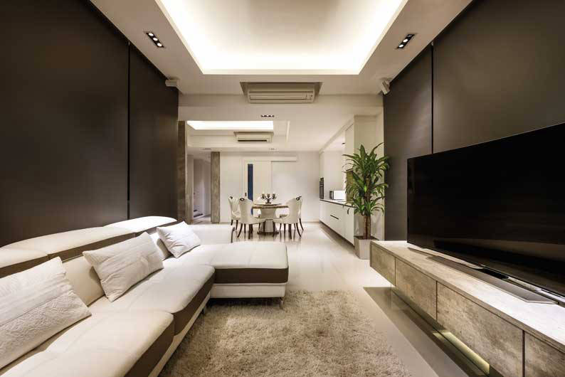 Designer Randy Tan carved out a compact foyer to welcome guests into the home. The main living space comes with a straightforward layout where the dining and living areas share one space. Several design strategies were employed to clearly define the two areas. Entering the living area, there’s a dramatic change in the ambience from the all-white dining area thanks to the dark wall claddings on opposite walls. To lift the dark hues, Randy incorporated furniture and built-in furnishings in a light colour.