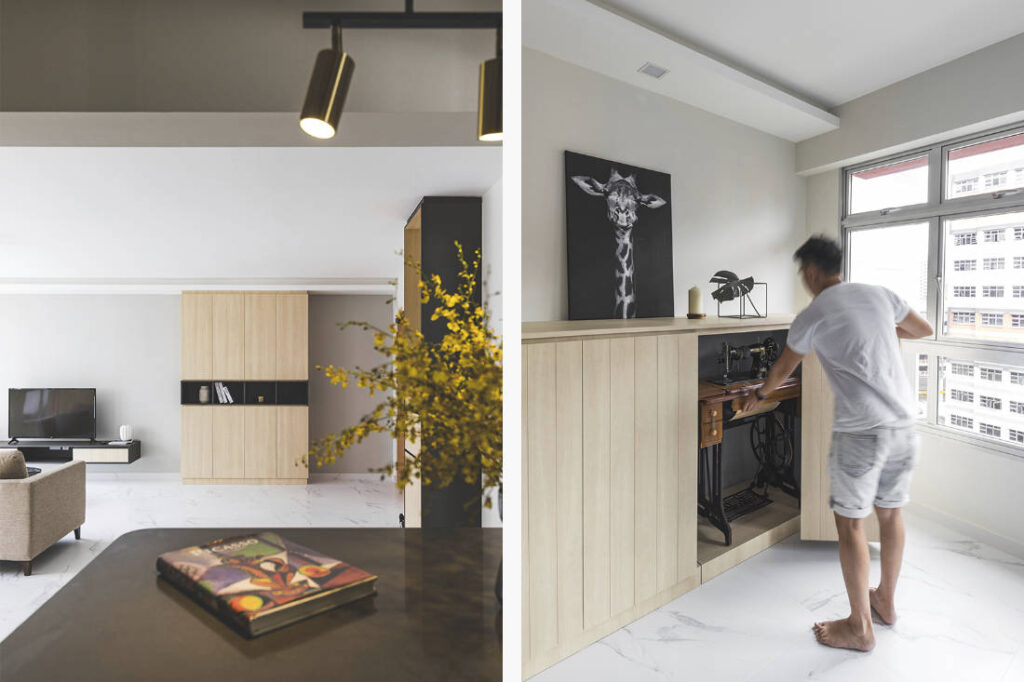 With its open layout and minimal furnishings, this flat would have registered as a minimalist’s home, except that the deliberate design approach indicates more than just aesthetic appeal. Says designer Ean Chu of Happe Design Atelier: “The space planning was heavily reliant on the needs of the inhabitants, especially the owner’s aunt who has limited mobility and navigates in a wheelchair. Walls were removed where possible, and the floors throughout are levelled and kept free of any obstructions to allow uninhibited movements.”